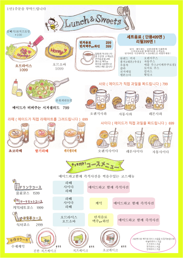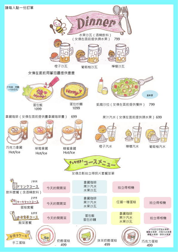 The menu at HoneyHoney is a delightful fusion of Japanese and Western cuisines, offering something for every palate. Signature dishes include the popular 絵描きオムライス, where your omelette is artistically decorated, bringing a smile before you even take a bite. For a heartier meal, try their 照り焼きチキン丼 or savory ピザ, which are as delicious as they are visually appealing. And don’t forget to complement your meal with their array of drinks—both alcoholic and non-alcoholic—including signature cocktails that showcase the creativity of the maids.